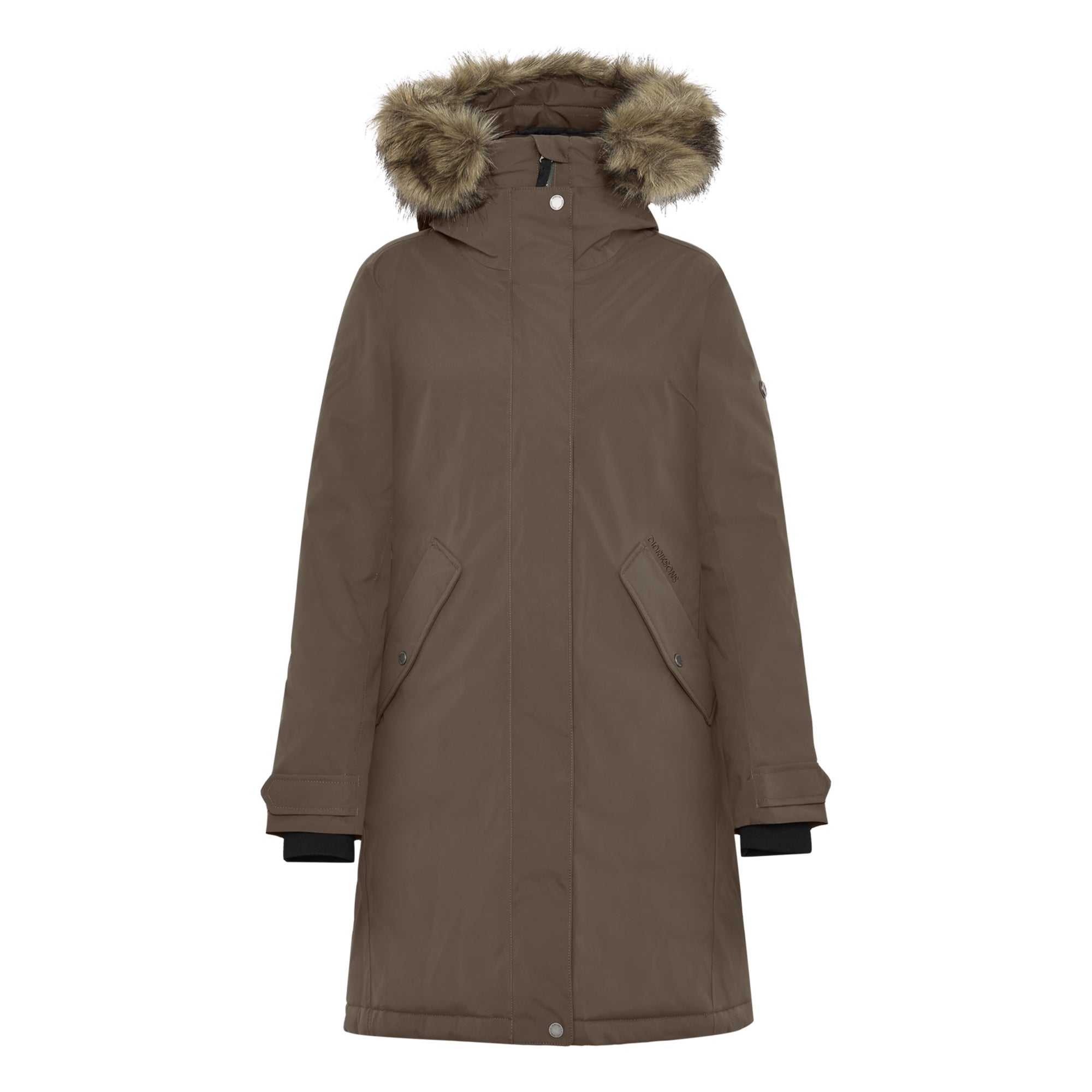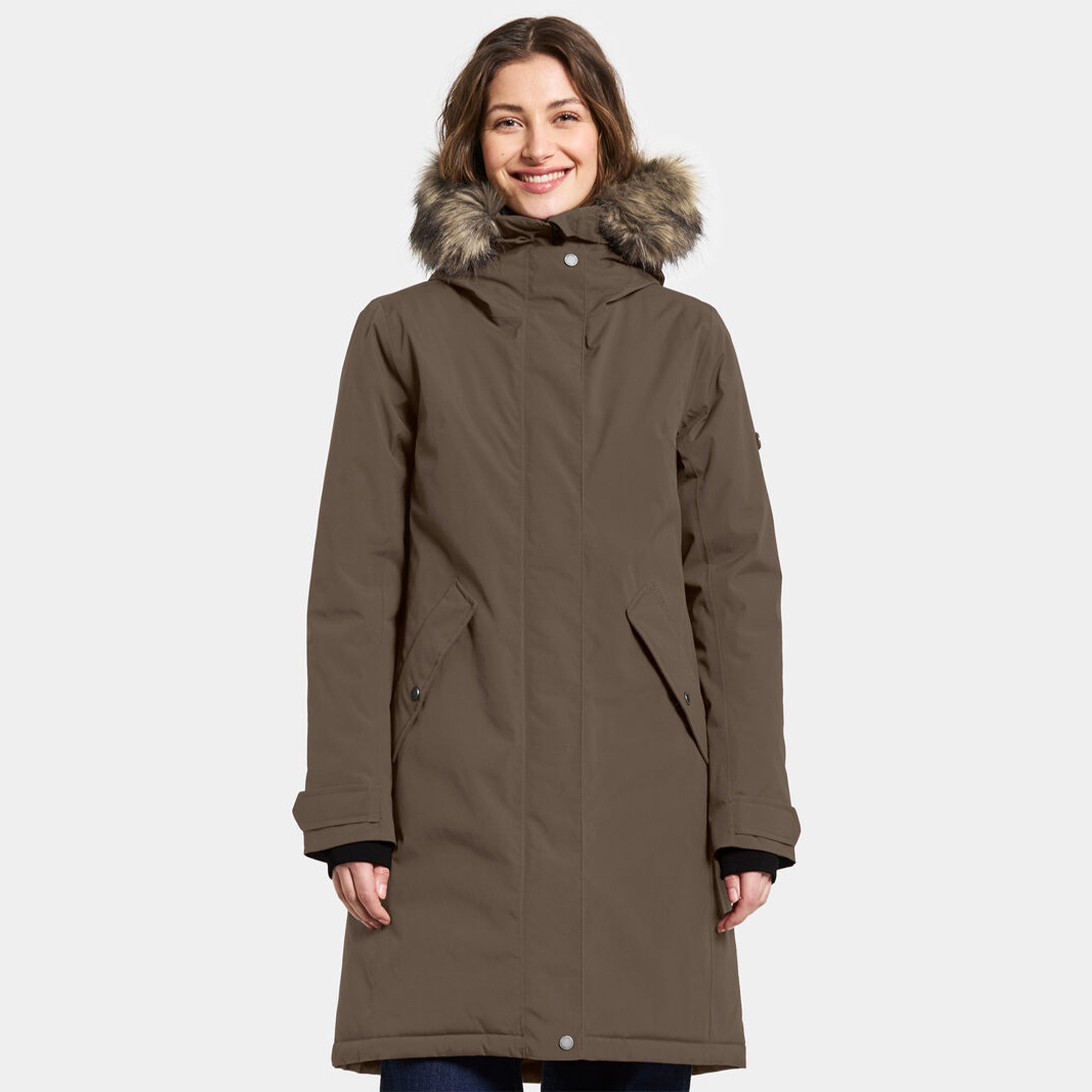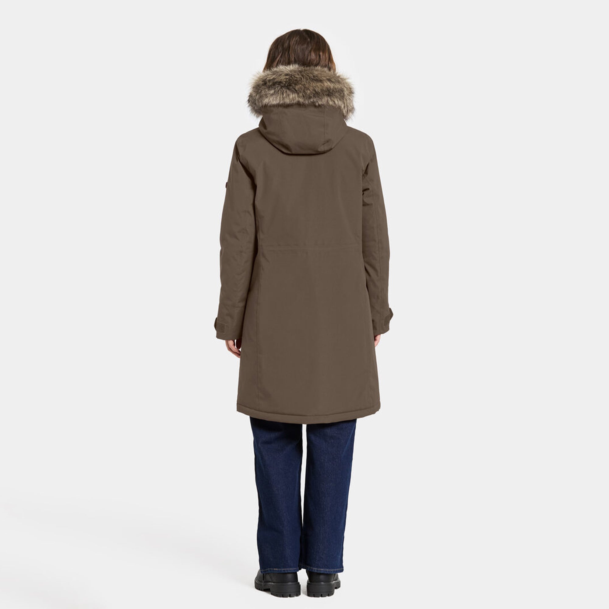 Erna is a warm parka with a feminine fit, perfect for everyday use. It is water- and windproof with taped seams and made from a breathable material, making it ideal for all weather conditions. The parka features a detachable synthetic fur on the hood and an adjustable waist with a drawstring for a personalised fit.