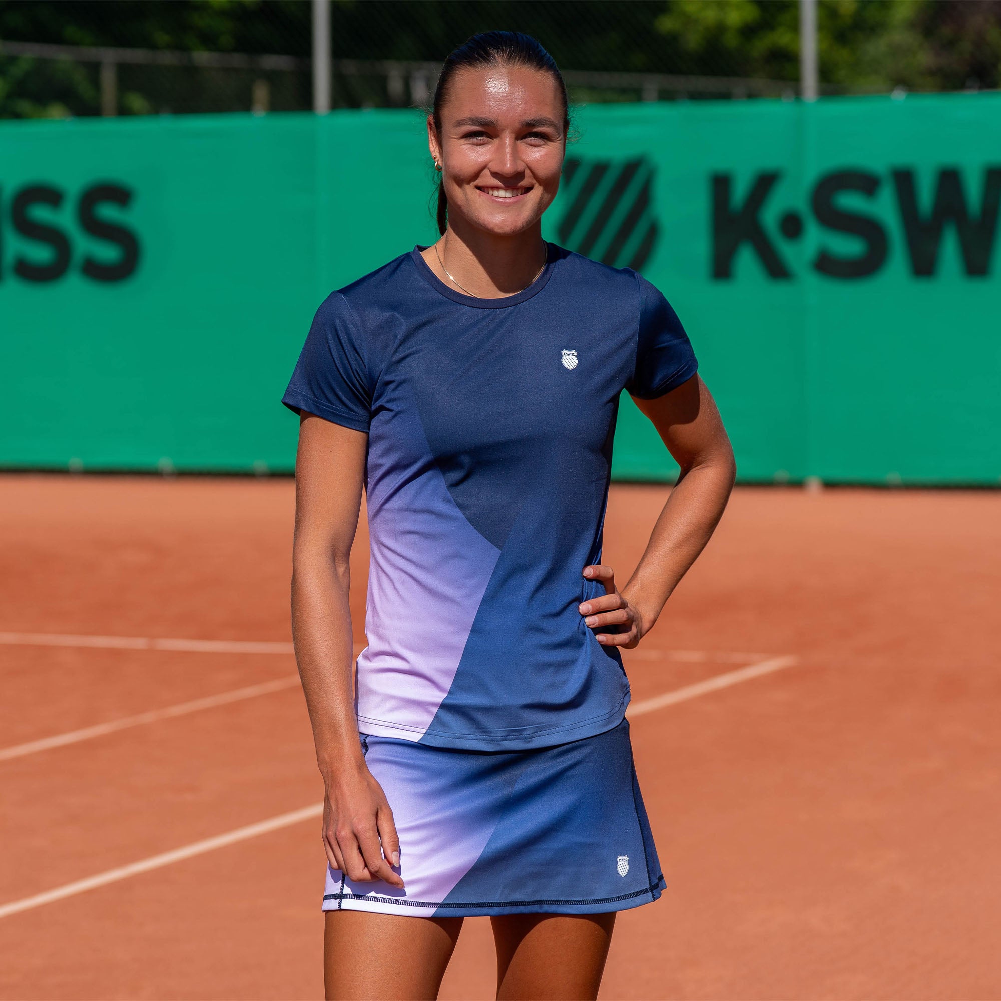 The HYPERCOURT PRINT TEE is designed for both performance and recreational players. It offers long lasting comfort during exertion and features a modern round neckline for a contemporary look. The K-Swiss shield appears on the front of the shirt, enhancing its aesthetic appeal, and it provides an excellent fit for prolonged use. The smooth seams feel soft and prevent irritation, making it perfect for long matches or training sessions.