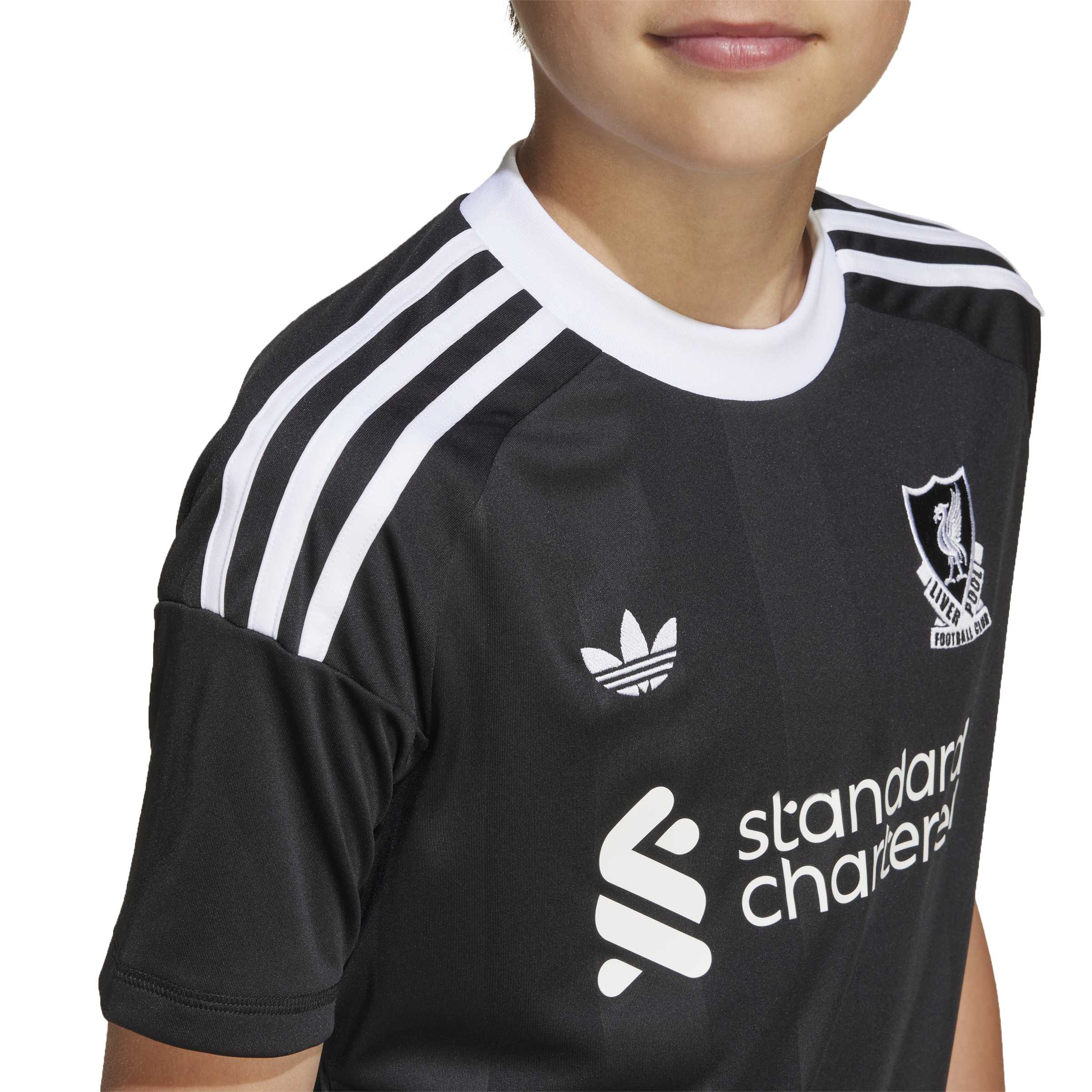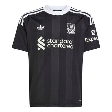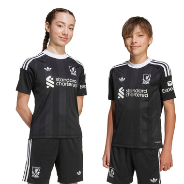 This juniors' Liverpool FC goalkeeper jersey shares its Trefoil and vintage club crest with the club's third kit outfield shirts. Clad in imposing black colours, it's designed to stretch with your every movement for first-class keeping. Behind the scenes, AEROREADY manages moisture to keep you focused on every football threat.