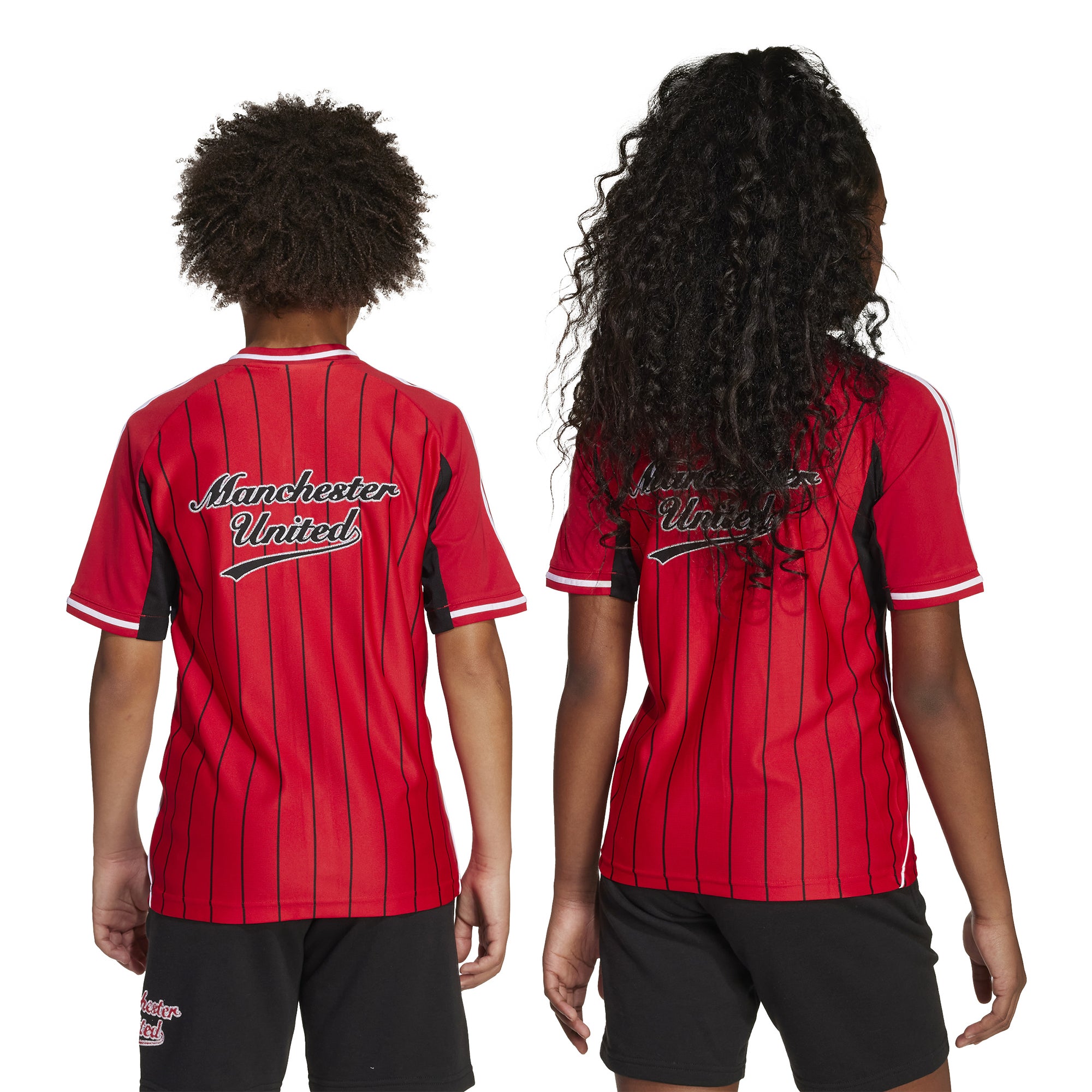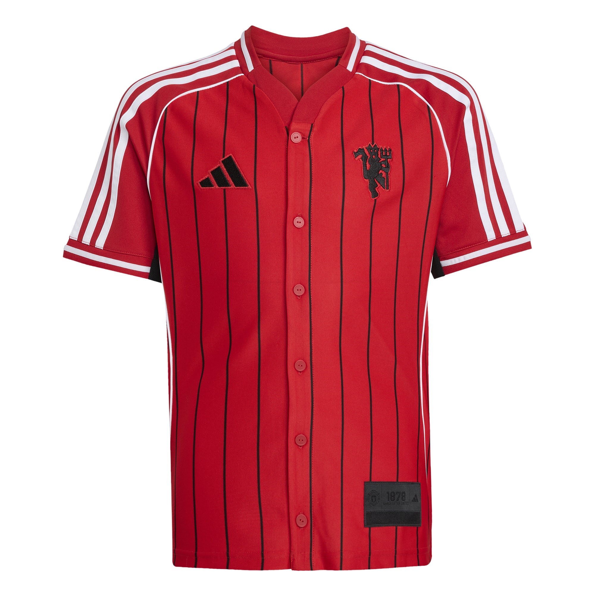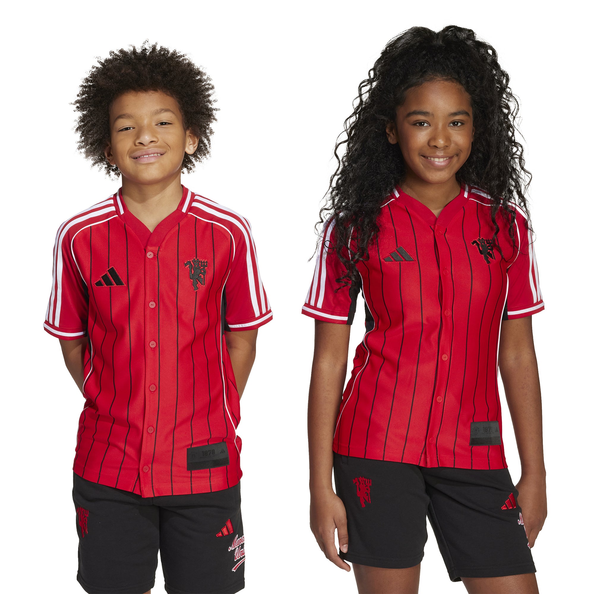 This juniors' Manchester United shirt from adidas features a baseball-inspired button closure and pinstripes that are sure to catch the eye whether you're picking your way through the Old Trafford crowds or simply out on the town. An embroidered red devil badge completes the look in club style.