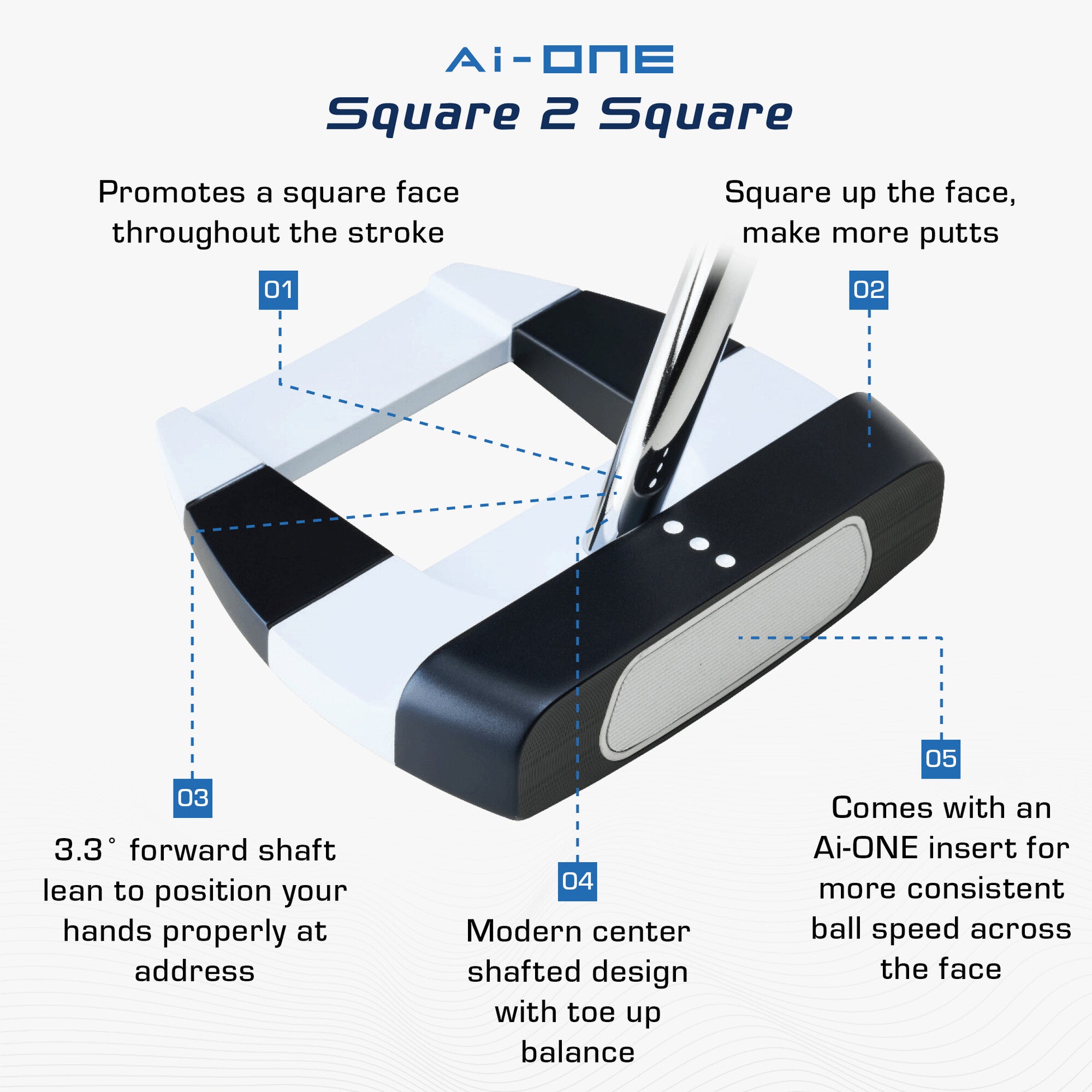Odyssey's new line of Ai-ONE Square 2 Square putters feature a modern centre shafted design that makes them Stroke Balanced so they want to stay square throughout a golfer's stroke. These putters are ideally suited for golfer s looking to minimize their face rotation when they putt.