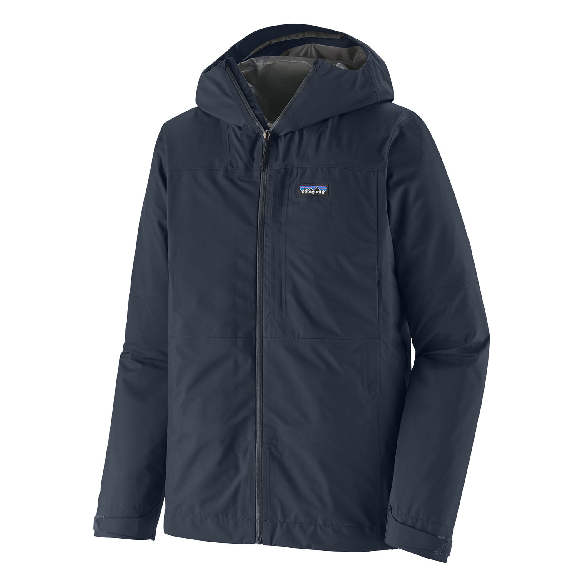 Minimal cuffs with streamlined hook-and-loop tabs seal out weather; an adjustable drawcord cinch at the hem, routed up through the front pockets, keeps out weather and reduces bulk under a pack waistbelt.