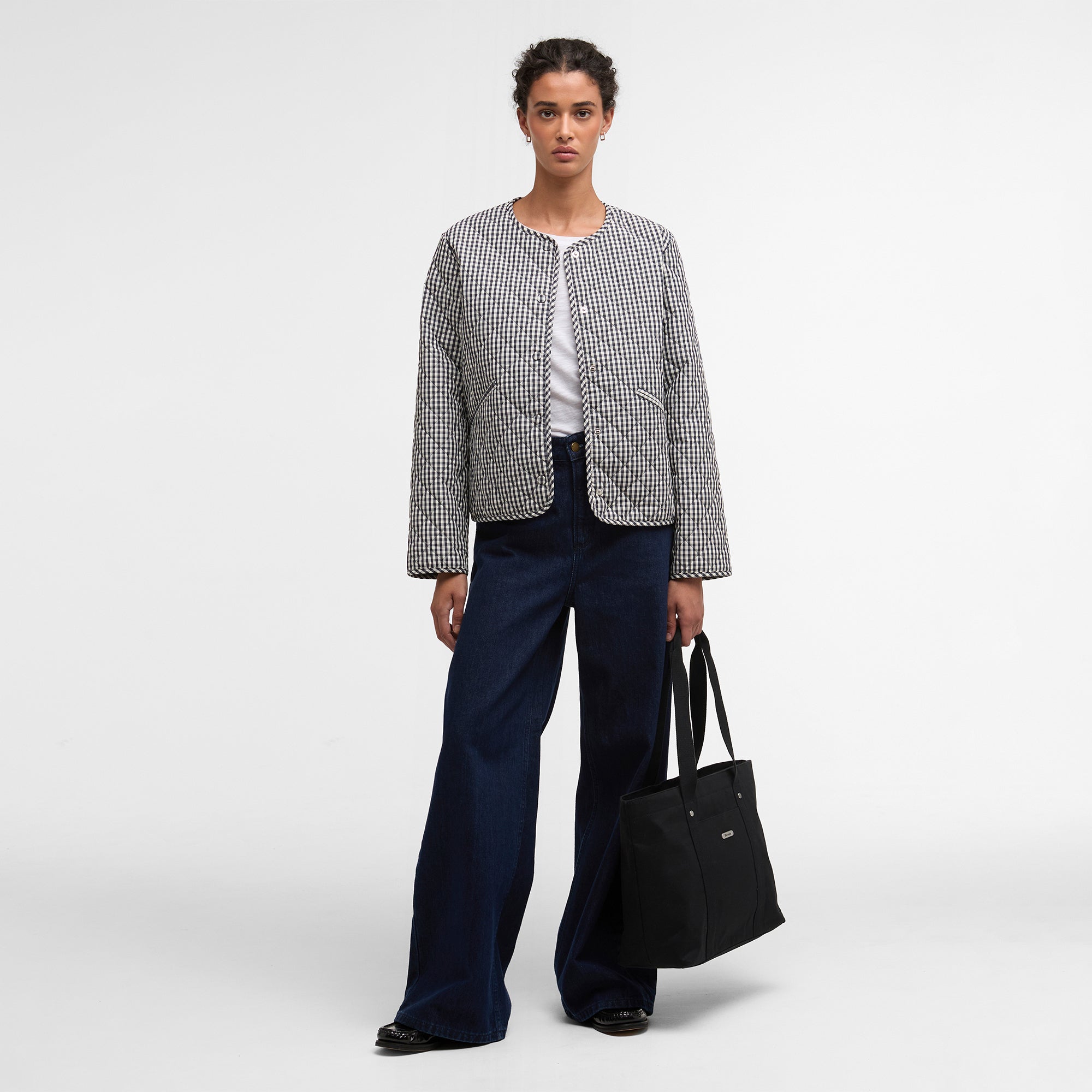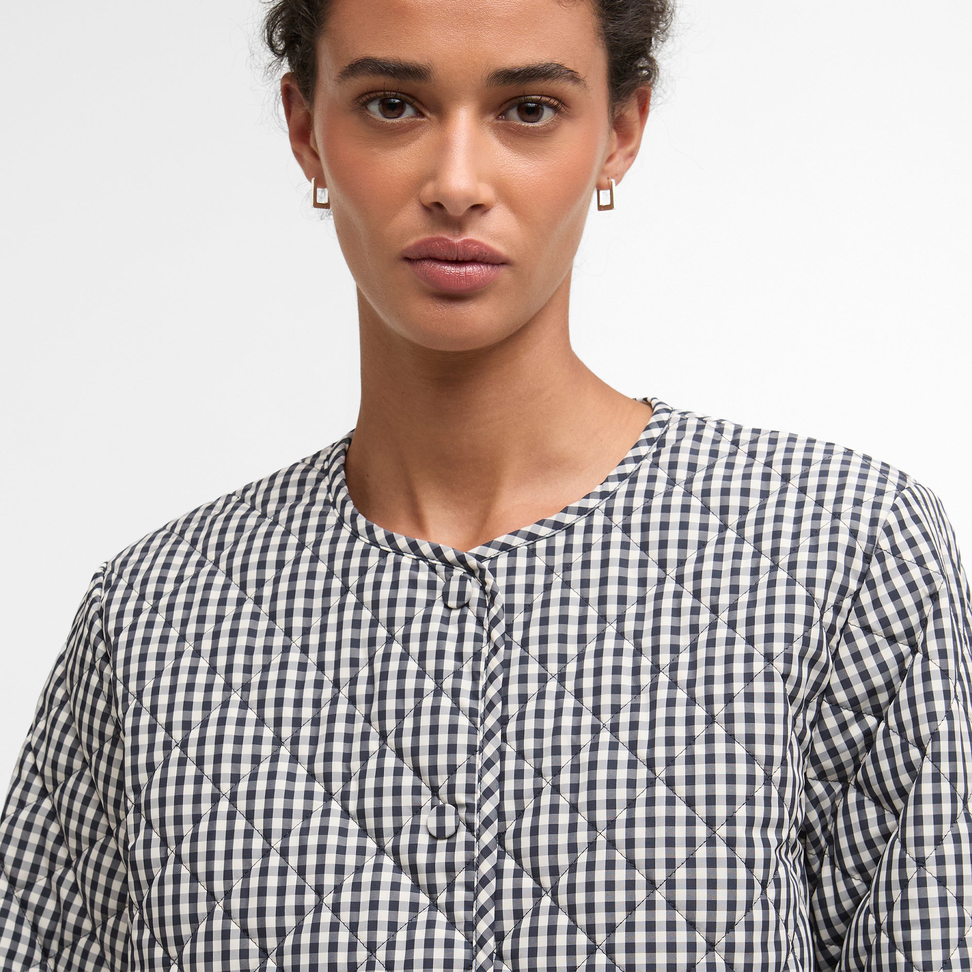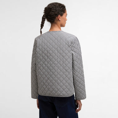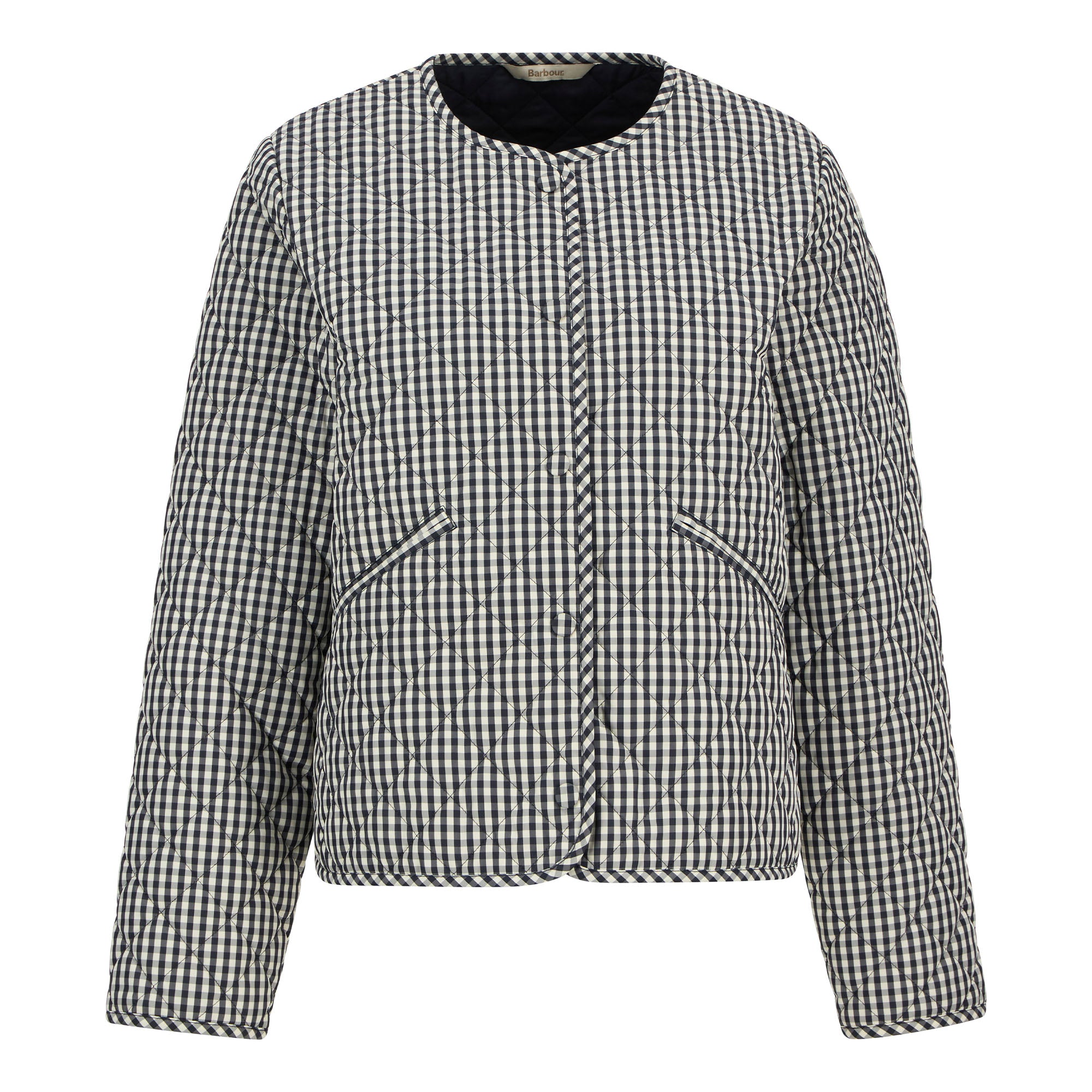 The Barbour Cashel Gingham Collarless Quilted Jacket is a lightweight, versatile layer perfect for transitional weather. Crafted with a short box quilt layered over seasonal tartan, it offers warmth without bulk. Featuring a self-covered stud front fastening, double jet pockets, and self-binding trim to cuffs and hem, this jacket combines practical functionality with timeless Barbour style, delivering a modern, heritage-inspired piece for effortless everyday wear.