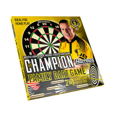 Experience the game of champions with the Harrows Darts 'Champions Family Dart Game'. Endorsed by PDC Champion, Dave "Chizzy" Chisnall, it's perfect for family fun. This tournament sized (18 x 1") paper coil steeltip game includes six 18g brass darts.