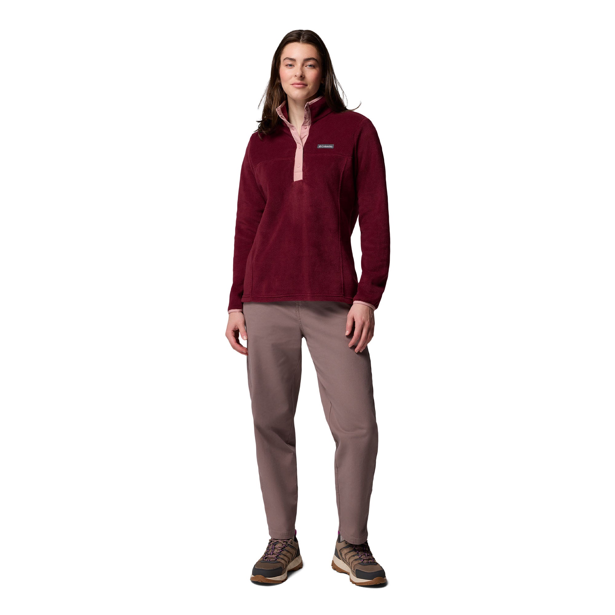 The panelled fleece features an of-the-moment half snap construction for a cool design that will keep you warm.