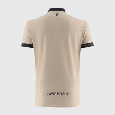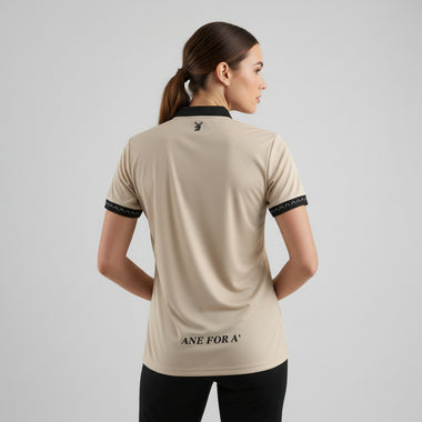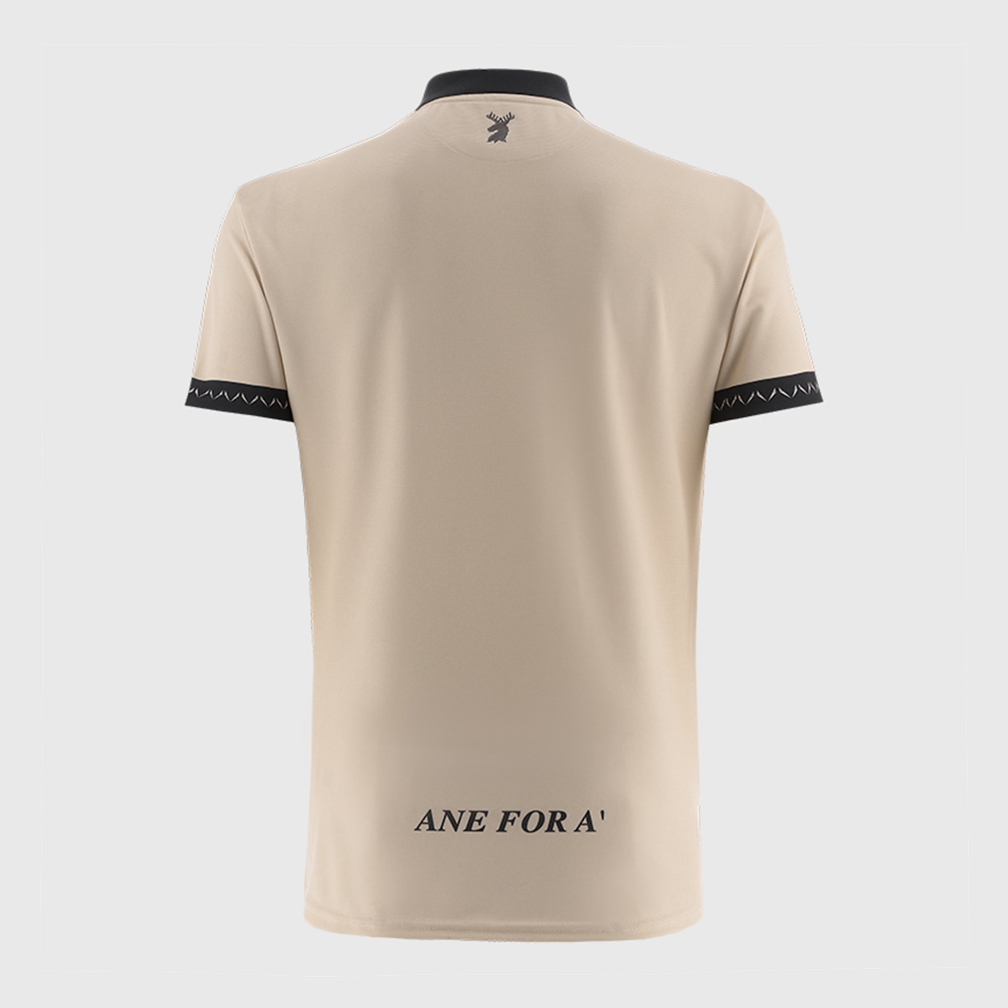This elegant jersey features a sophisticated golden beige palette with charcoal grey accents, complemented by a refined collar and striking cuff detailing. The modernised steeple crest takes centre stage, whilst the back showcases the stag's head from the Falkirk coat of arms and the town motto "Ane for A'" – a powerful reminder of unity and shared heritage.