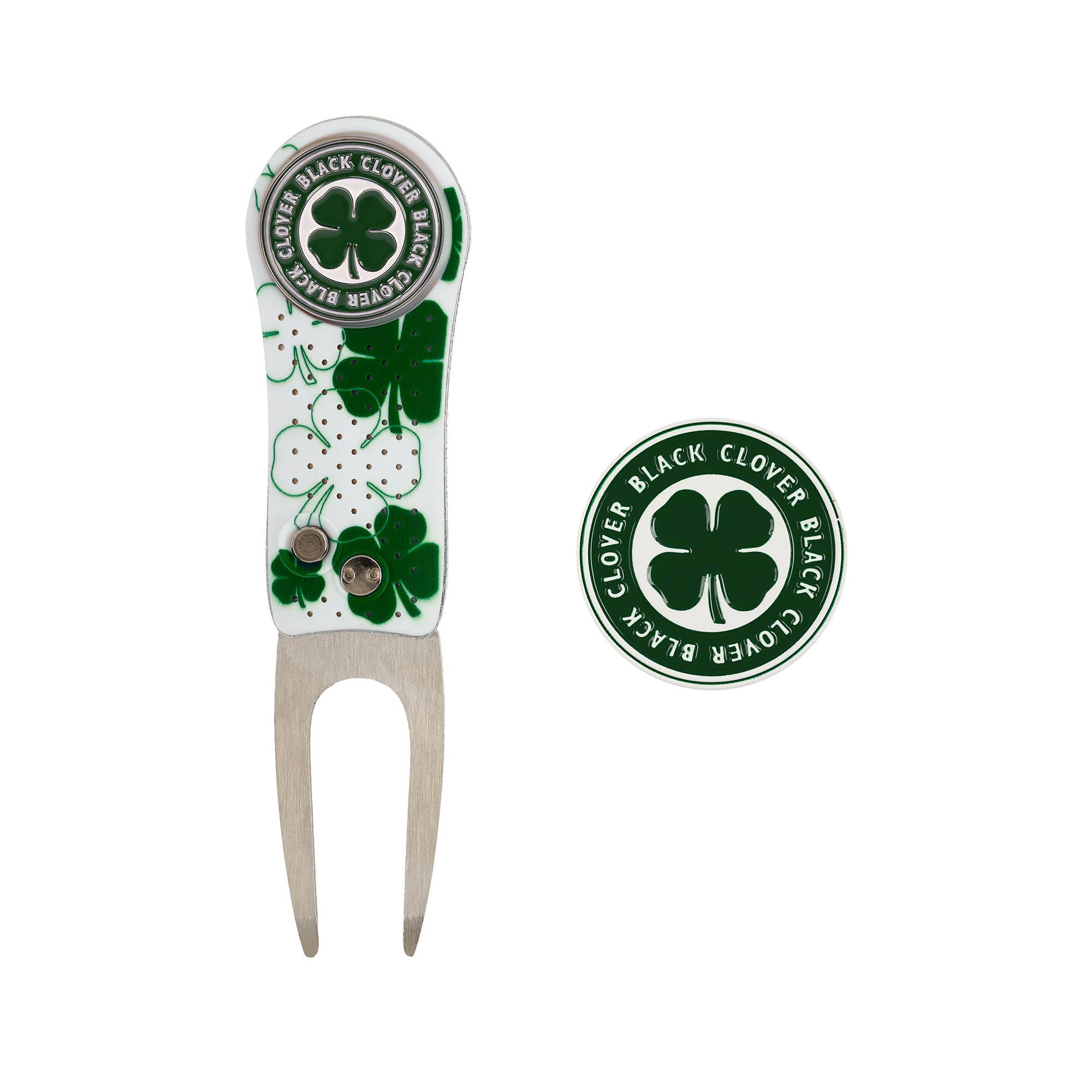 This set includes a stylish and durable divot repair tool, a magnetic ball marker, and an oversized coin for versatile use on or off the course!