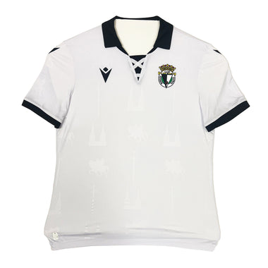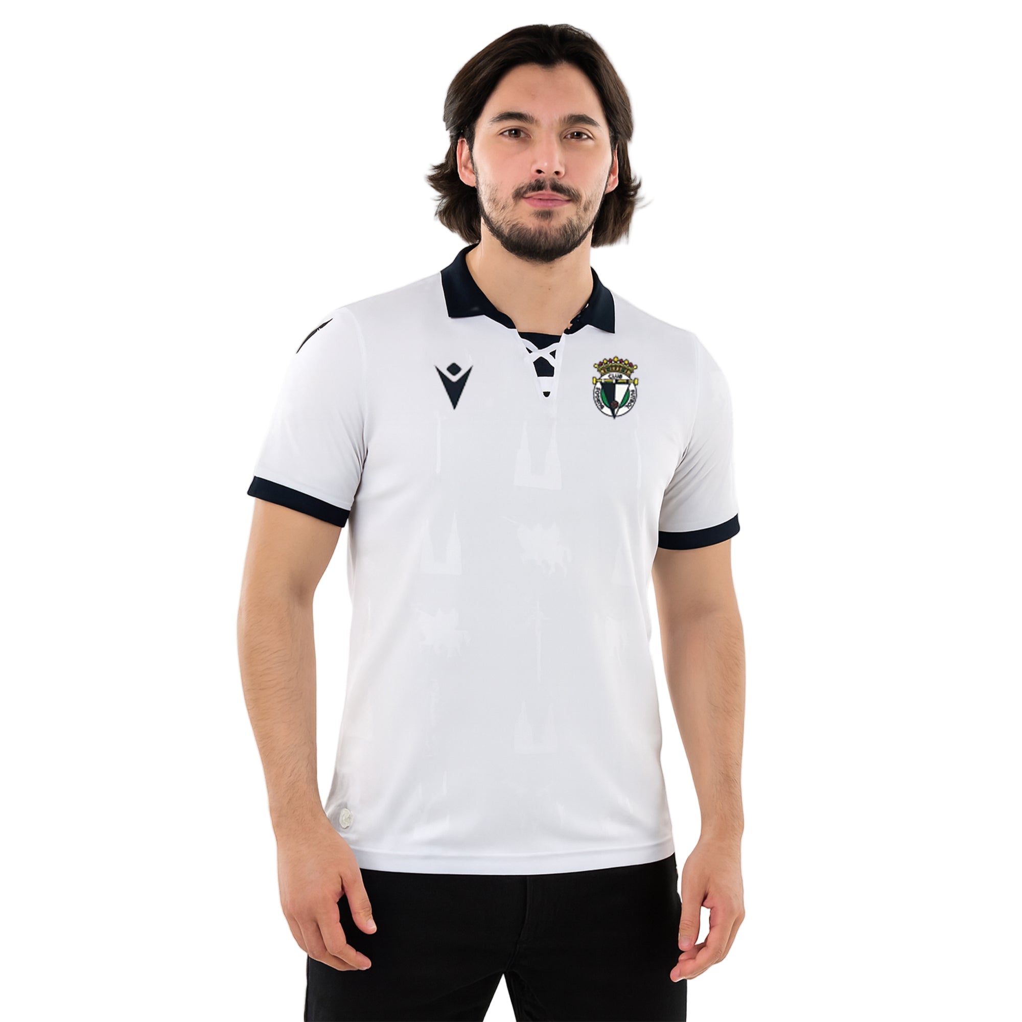 The Burgos CF 25/26 Home Football Shirt by Macron features a crisp white design with a contrasting black collar.