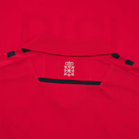 The polo collar and ribbed sleeve edges recall a classic style, while the navy blue details on the shoulders add character and reinforce tradition. A distinctive graphic symbol is applied on the back of the collar, while inside, at the bottom of the shirt, a personalised tape pays tribute to the club's participation in major European competitions.
