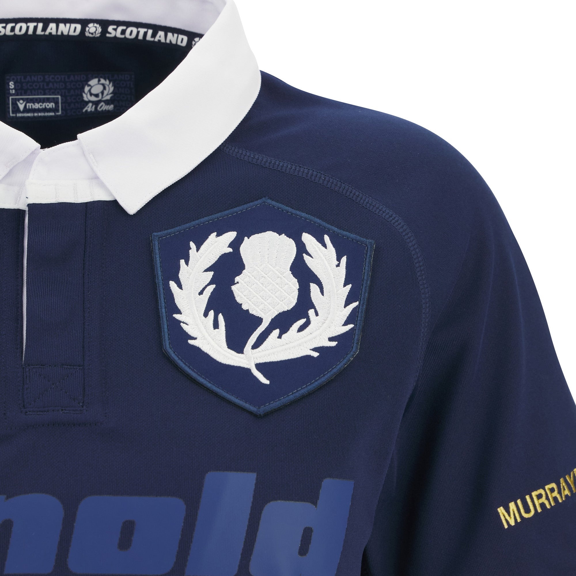 This shirt also features the current thistle on one sleeve and an embroidered tribute to the 100th anniversary of Murrayfield Stadium on the other.