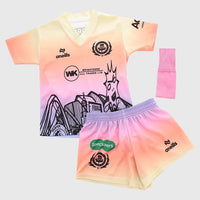 This cream-coloured ensemble features a shirt, shorts, and socks decorated with playful subtle patterns and bright red and yellow highlights on the collar and sleeves.