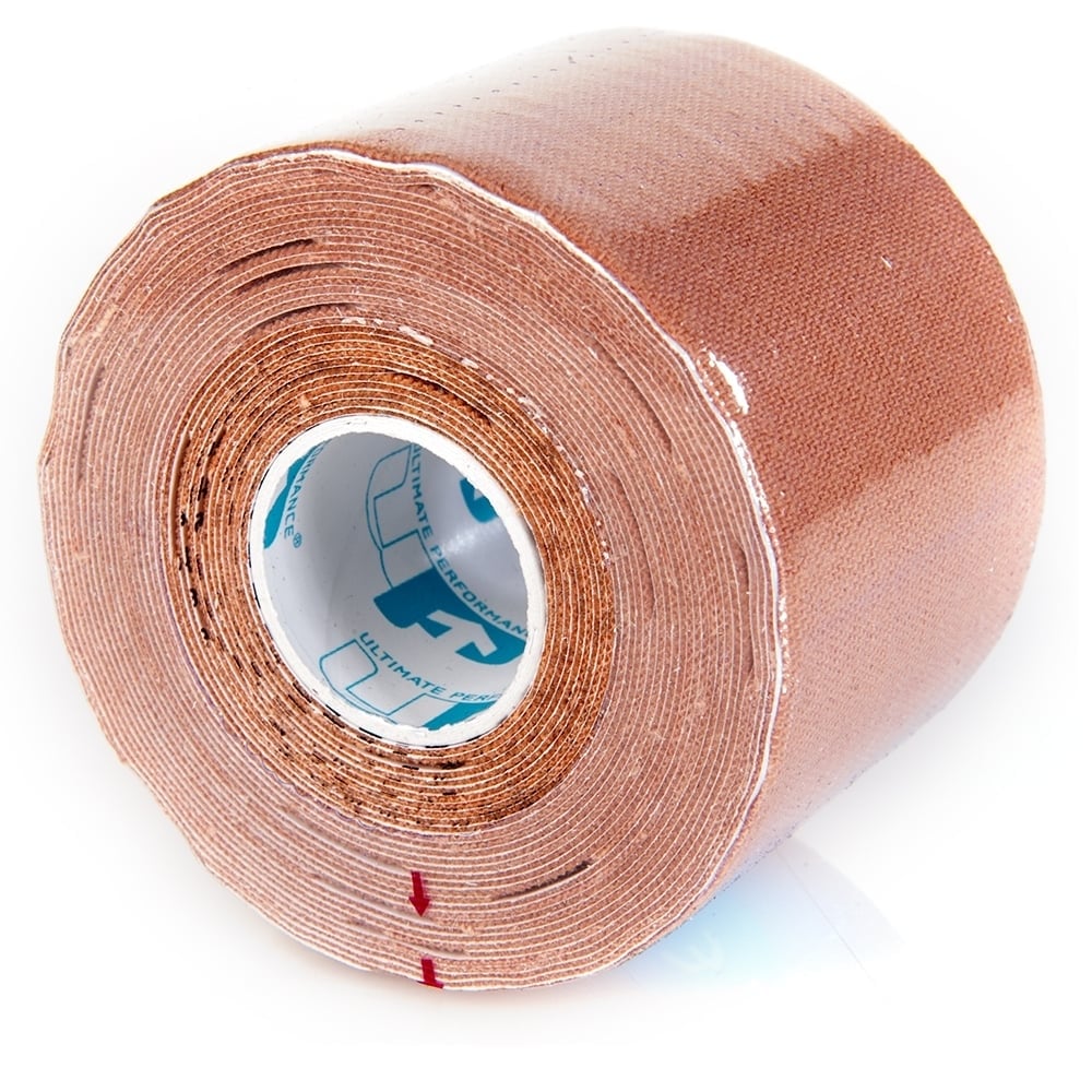 Ultimate Performance Kinesiology tape (brown) can be applied across muscle groups to support muscle recovery, improve blood circulation, and allow muscle injuries to heal. By pushing the flow of blood and lymphatic fluid, muscle inflammation can heal and protect from further muscle injury whilst still allowing an athlete full movement and motion. Other colour varieties are available.