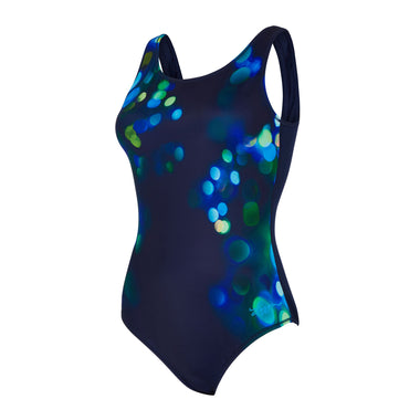 Make a statement this season in the Zoggs Purity Scoopback swimsuit. The subtle tones of blue, green and white sephrical bursts on a dark blue base colour are perfectly placed to flatter your figure. The scoop back and medium leg height create a sleek and stylish silhouette, while the full foam cups and front lining offer support and coverage.