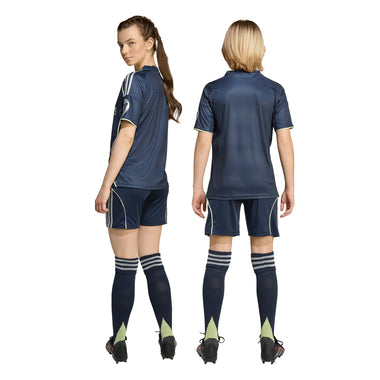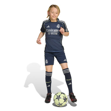 These juniors' adidas football shorts belong to a Real Madrid kit that salutes the club's renovated stadium. A reflection of the Bernabéu's gleaming facade, silver metallic details stand out against bold navy colours. Keeping things comfortable in the background, AEROREADY deals easily with moisture.