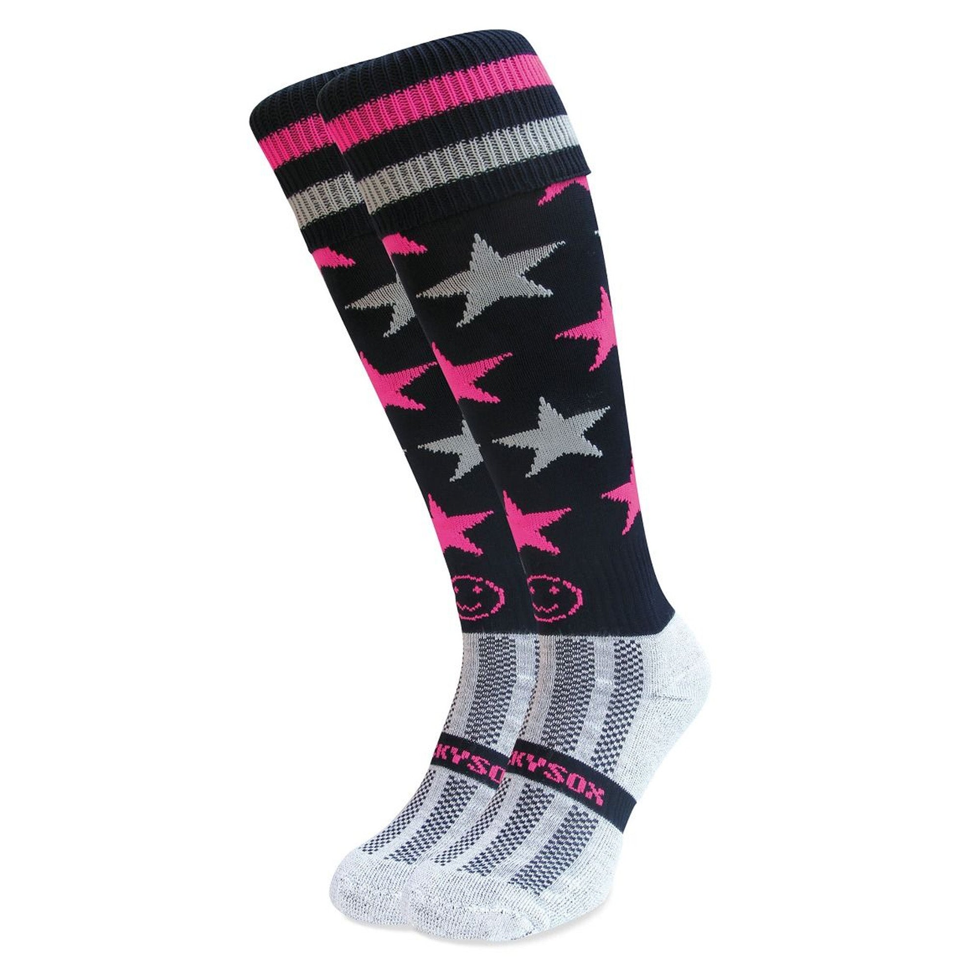 Super Stars WackySox are navy blue knee length socks with images of stars in bright pink and silver grey dotted around the leg. There is a bright pink Wacky face logo on the front of the ankle and the turnover top has bright pink, silver grey and navy blue hoops. WackySox are high performance sports socks made in Great Britain. They feature a