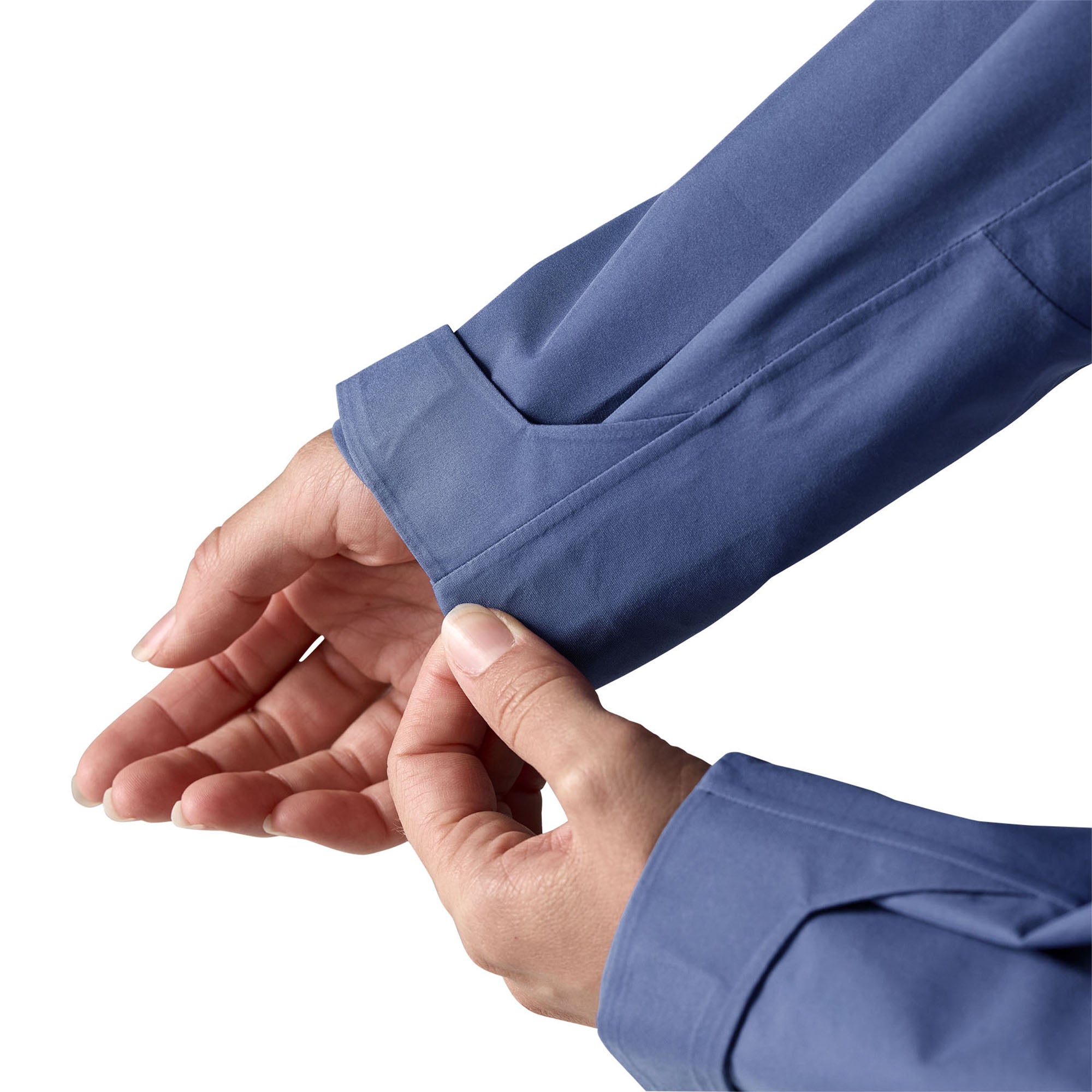 Low-profile cuffs use a tapered tab hook-and-loop closure for a tight wrist seal; a dual-adjust drawcord hem seals out weather